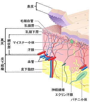 この毛細血管は皮膚の中にたくさんあるのです。人間の皮膚は外側が表皮、その下に真皮があり、 下の皮下組織があります。この真皮の部分に、毛細血管が集まっています。