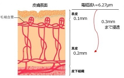 波長λ=6.27μmの電磁波は、表皮から0.3μmまで到達できます。 すると、体の毛細血管内で、血液が温まって血流が良くなります。全身の 毛細血管内を流れる赤血球が細胞ひとつひとつに酸素を供給してくれます。 がん細胞には『酸素』が行き渡り、がん細胞を攻撃してくれるのです。