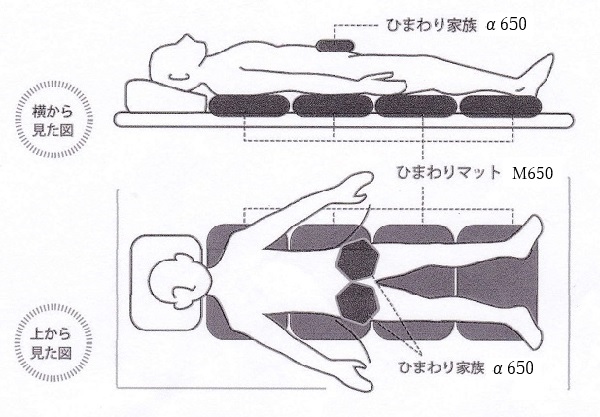 『ひまわり』はパネルタイプの『α650』とマットタイプの『M650』に分けられます。 実際の使用例は下のようになりますが、イスの座る下に敷いたり、背もたれに付けて、 背中と挟んで使用したりしても構いません。
